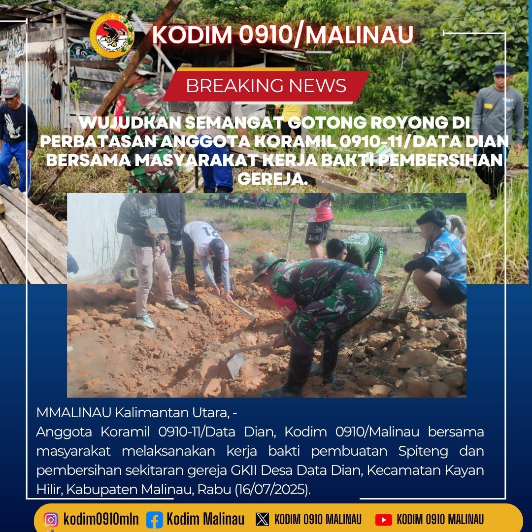 MALINAU Kalimantan Utara,- Anggota Koramil 0910-11/Data Dian, Kodim 0910/Malinau bersama masyarakat melaksanakan kerja bakti pembuatan Spiteng dan pembersihan sekitaran gereja GKII Desa Data Dian, Kecamatan Kayan Hilir, Kabupaten Malinau, Rabu (16/07/2025).