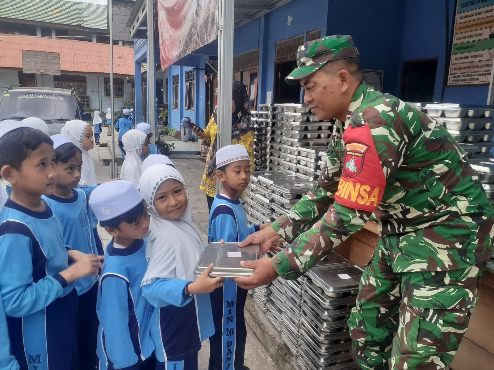 Martapura – Kodim 1006/Banjar mendukung penuh pelaksanaan program Makan Bergizi Gratis (MBG) yang dilaksanakan oleh Yayasan Forum Relawan Jaber bekerja sama dengan Catering Handayani. Kegiatan pendistribusian dipusatkan di MIN 16 Banjar, Kecamatan Martapura, Kabupaten Banjar, Rabu (03/09/25).